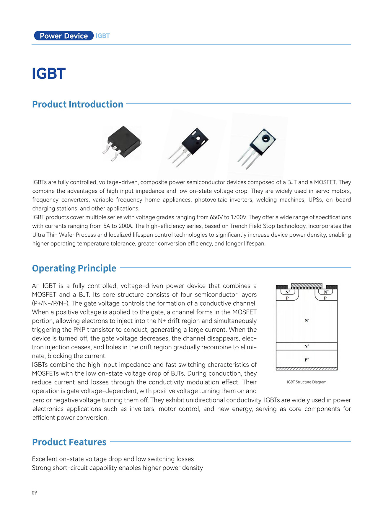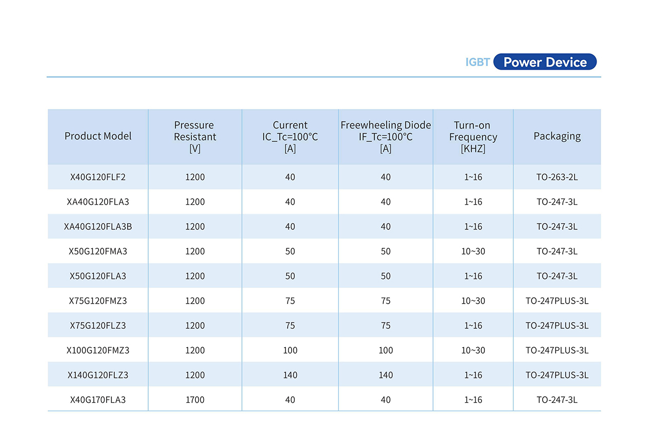 Notre gamme de produits IGBT couvre plusieurs séries avec des tensions nominales allant de 650 V à 1700 V et les notes actuelles de 5 A à 200 ALa série à haut rendement, développée avec Technologie Trench Field Stop, Procédé de fabrication de plaquettes ultra-minces, et contrôle localisé de la durée de vie, permet d'obtenir une densité de puissance plus élevée, une meilleure tolérance thermique, une efficacité de conversion accrue et une durée de vie prolongée.