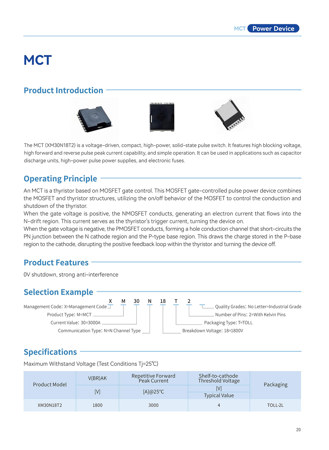Le MCT (XM30N18T2) est un alimenté en tension, compact, et commutateur à impulsions à semi-conducteurs haute puissance Conçu pour les applications exigeantes en matière de puissance pulsée. Il offre tension de blocage élevée, excellente capacité de courant d'impulsion direct et inverse, et commande de conduite facile, garantissant un fonctionnement fiable et efficace.