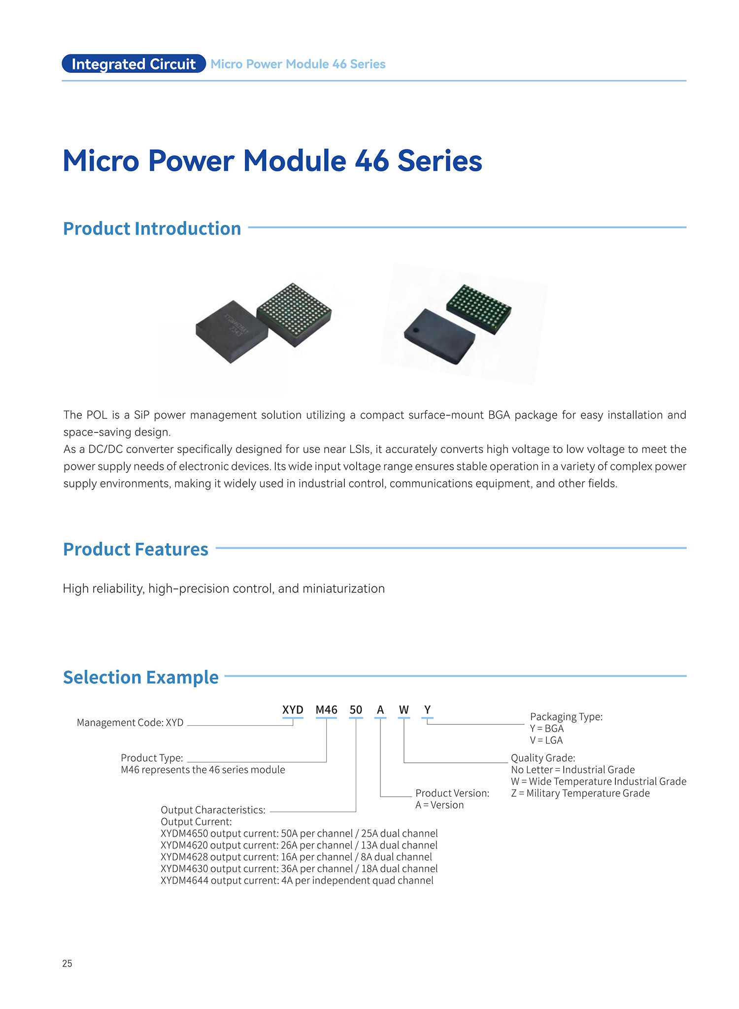 L'alimentation POL (Point-of-Load) de la série 46 est une solution de gestion de l'alimentation intégrée (SiP) dotée d'un boîtier BGA compact à montage en surface, facilitant l'installation et optimisant l'espace. Conçu spécifiquement pour les applications à proximité des circuits intégrés à grande échelle (LSI), ce convertisseur CC/CC abaisse avec précision les hautes tensions en basses tensions afin de répondre aux besoins en énergie des systèmes électroniques.